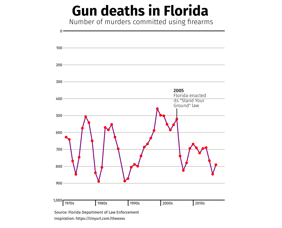 The original visualization appeared in the article This Chart Shows An Alarming Rise In Florida Gun Deaths After 'Stand Your Ground' Was Enacted article by Pamela Engel on Business Insider on February 18, 2014.