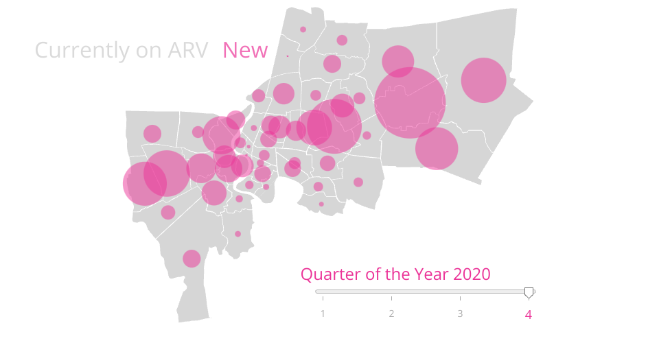 The SVG Mmap was load using D3 and eventListener was implemented on hover to show the number of new HIV cases in each district in year 2020. The size of the circle depends on the size of new HIV cases: bigger means larger number of cases. User can use the menu bar to select more data to show (i.e. switching between TX_NEW and TX_CURR) and add the menu to select between each quarter in 2020 (Q1 - Q4).