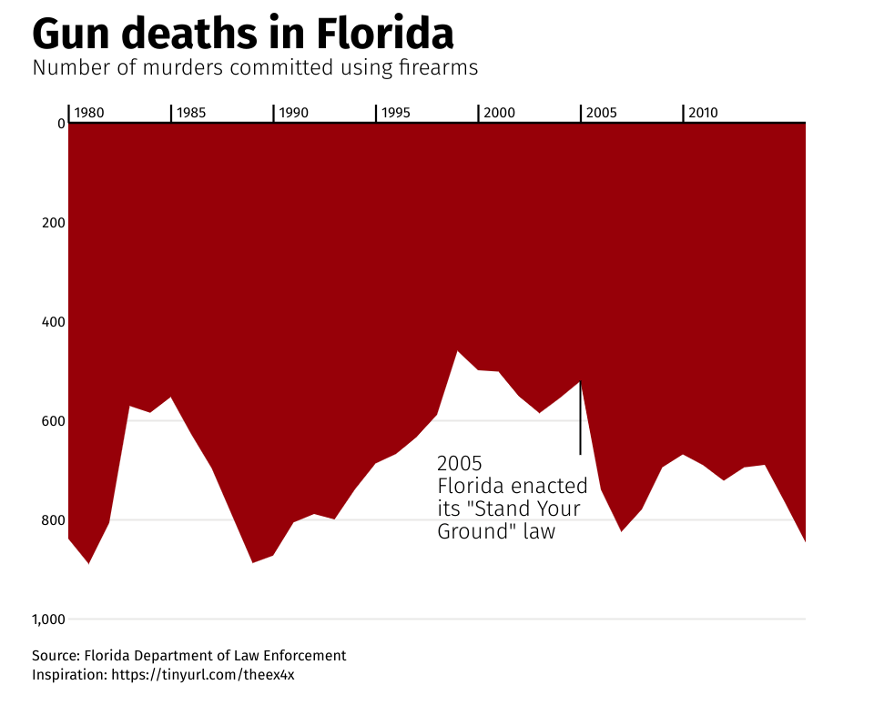 The original visualization appeared in the article This Chart Shows An Alarming Rise In Florida Gun Deaths After 'Stand Your Ground' Was Enacted article by Pamela Engel on Business Insider on February 18, 2014.
