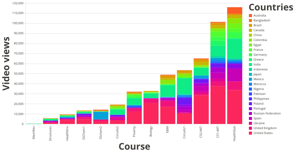 A visualization of video views according to HarvardX or MITX course on EdX for the 2013 academic year. These are the number of view counts per viewer. The color in the stacked bars reflect the countries from which the view events emanated.
