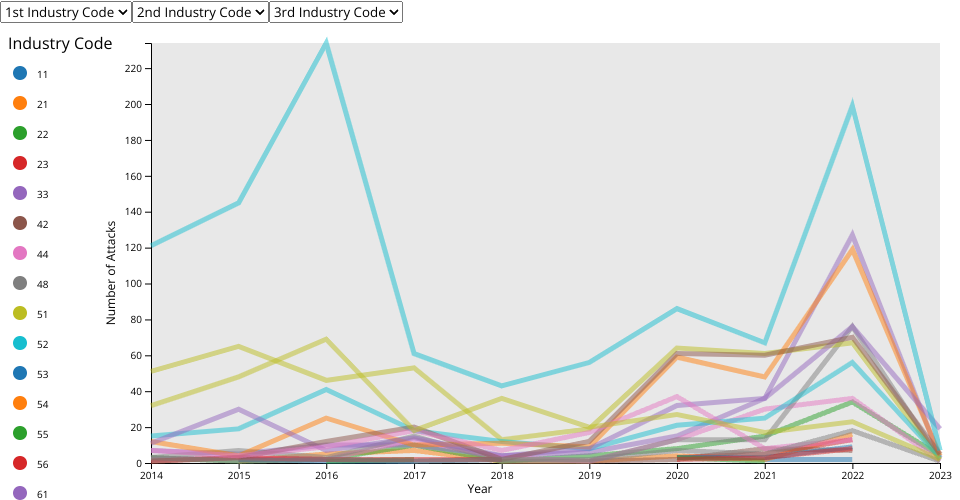 v1 - Added drop down menus so the user can add up to three industry codes to track at once. Code heavily influenced by prof curan's menu with d3 and eschuman's interactive scatter plot.
