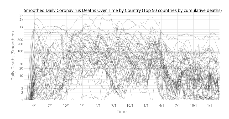 This variant shows daily death numbers, smoothed using the repeated averaging technique described in D3: Histogram Blur / Smoothing, for the top 20 countries by cumulative deaths.