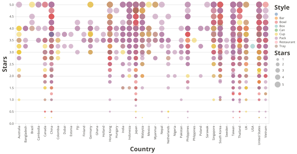 A visualization constructed using the vega-lite-api. The visualization is all about Ramen Ratings! The picture includes information about the ramen score, style and which country it comes from.