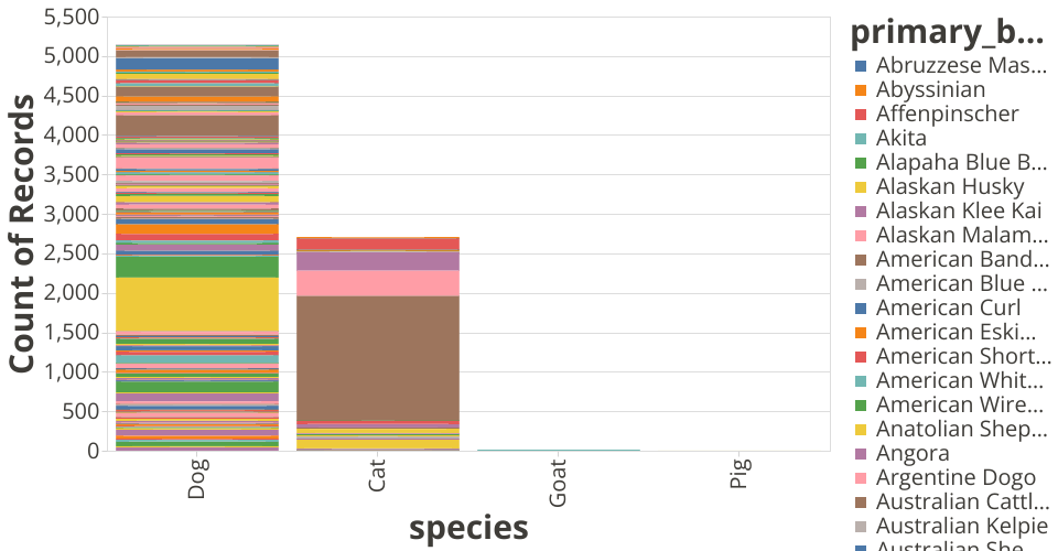 This is a visualization of the dataset Seattle Pets which shows the number of pets based on species that is broken up based on breed. We can see through this stacked bar chart that people really like to have dogs over cats. We also see that the most popular dog breed is a labrador retriever whereas the most popular car breed is domestic shorthair.