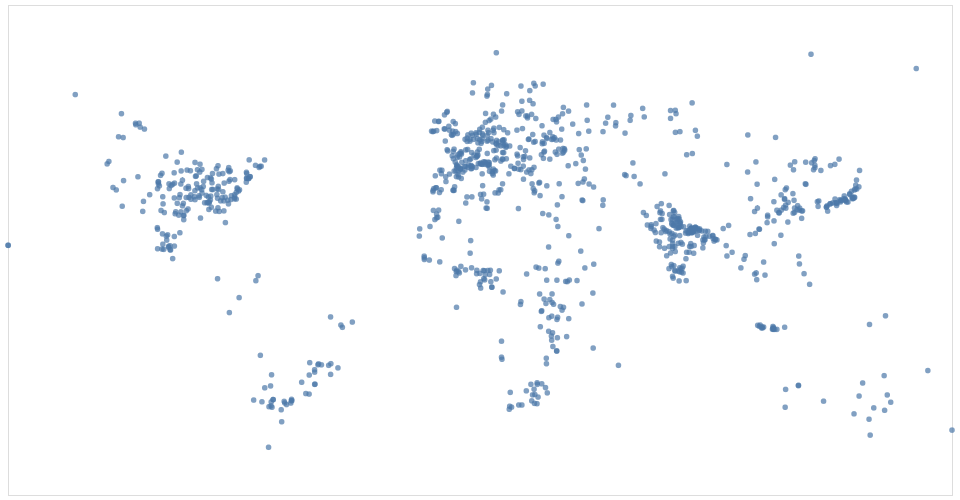 This is a visualization for Fallen Meteorites that shows a map of where each reported meteorite fell by longitude and latitude. Even though there isn't a map behind these points, we can see outlines of the continents. We can see that there is a large amount of landing spots in the USA, Europe, and India. In Africa, it looks like most landing sites were along the coast instead of being inland. This closely represents a world population map which might be because the more populated a place is, the more likely a fallen meteorite will be reported!