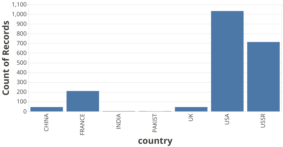 This is a visualization of the dataset Nuclear Explosions that shows how many deployments there were per country.