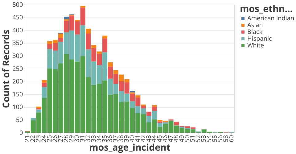 The stacked bar chart above depicts the age of the officer named in the complaint. The different colors indicate the ethnicity of the officer (refer to legend on right of chart).