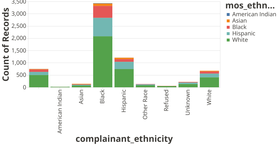 The stacked bar chart above depicts the number of complaints based on complainant ethnicity. The different colors indicate the ethnicity of the officer referenced in the complaint (refer to legend on right of chart).