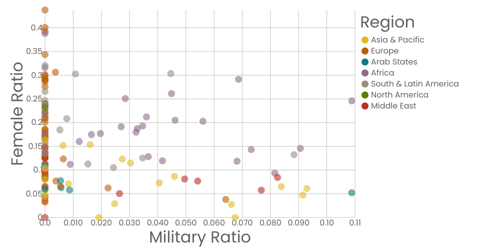 NOTE: Singapore and Myanmar were removed. Singapore's military ratio was 0.36 and its female ratio was 0.05. Myanmar's military ratio was 0.54 and its female ratio was 0.01. These countries were removed because the military ratios were compressing the scale of the x-axis so that it was difficult to observe patterns in the rest of the data