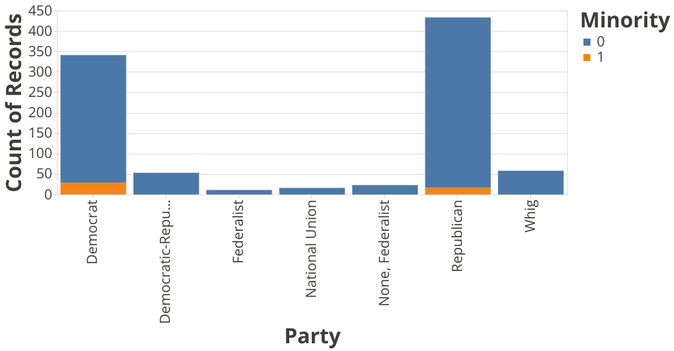 The stacked bar chart above provides the number of minority individuals in American cabinets based on the party affiliation of the individual involved.