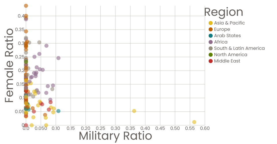 The chart plots the female ratio against the military ratio of governmental cabinets of countries based on region. The ratios are taken as the 11-year average for each country for the years 2006-2016. Countries that experienced regime/system change during the 11-year window are excluded from the dataset.