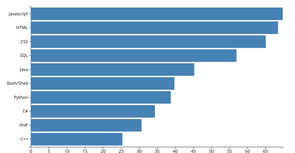 This bar chart shows the top 10 technologies used by StackOverflow survey respondents in 2018 by percentage 2018 Developer Survey Results.