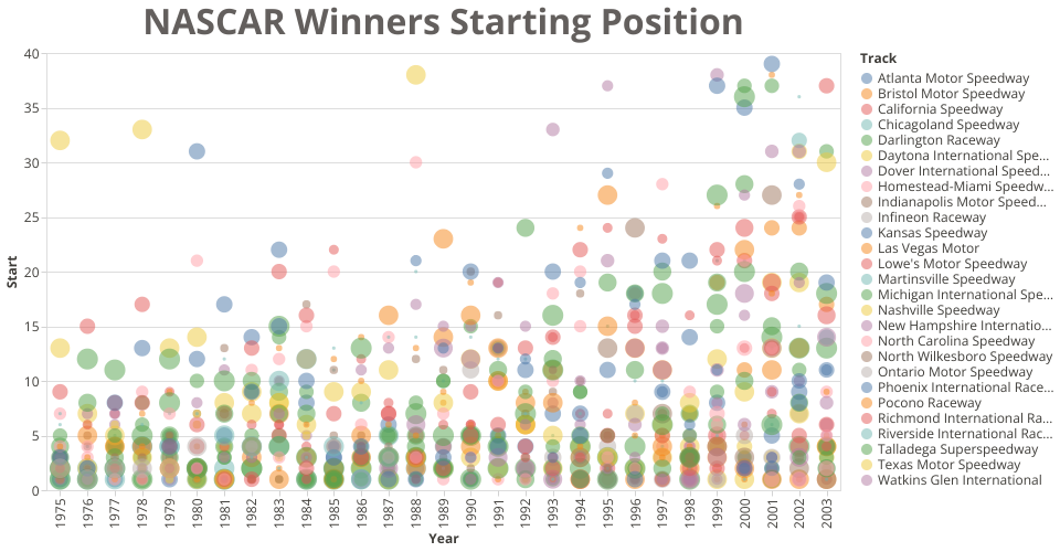 This scatterplot is an expansion upon a previous viz I created that shows NASCAR winners by starting position, split by year. That viz was very simple in that the points were all the same color, and the same size. Thus, this plot colors the points by the track name, and sizes them by the track length. This provides the viewer with an opportunity to look for patterns, particularly among tracks and track types. For example, one may notice that the larger dots (such as the 2.66 mile Talladega Superspeedway) produce a lot more winners from further back in the field than short tracks like the .526 mile long Martinsville Speedway where passing is harder. This data comes from a rendition of the NASCAR dataset, which spans from 1975 to 2003.