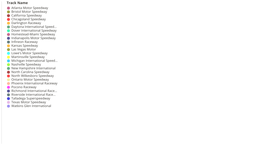Goal: When this viz is added to the dashboard, selecting a track will filter this viz for that track, so the viewer can see how well the different makes have done at a specific track. When selected, the dots will change color to match that track's color in other visualizations.