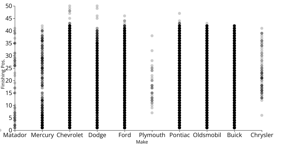 A scatter plot showing car make and finishing position for those cars using the NASCAR dataset. As a reminder, this data spans the years 1975-2003.