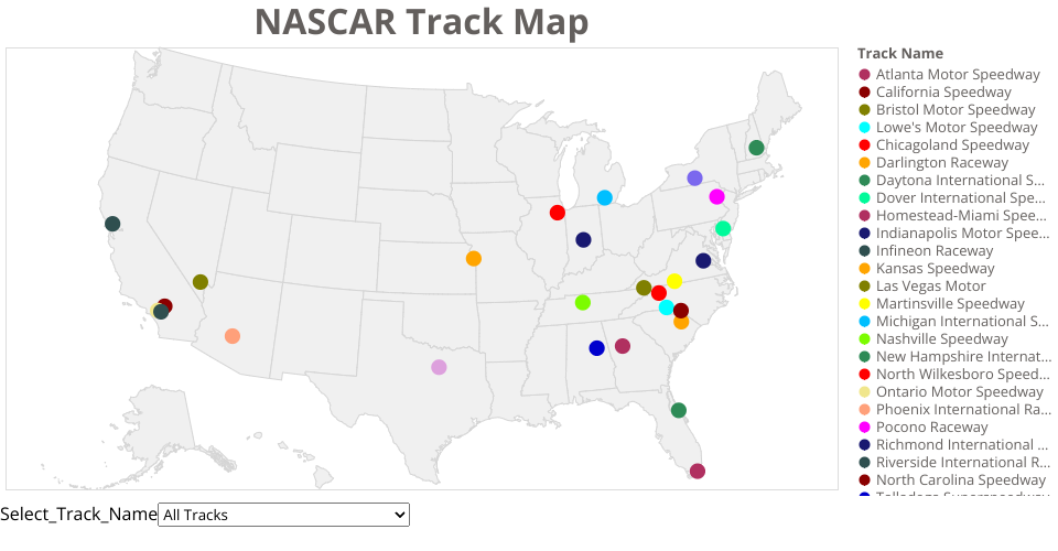 A map showing the locations of the 27 tracks NASCAR ran races on from 1975 to 2003. The tooltip displays information such as the name of the track, its type, its length, whether or not it is active, and which driver has the most wins there. The data used in this visualization is derived from a dataset which contains information on every NASCAR race run from 1975 to 2003.