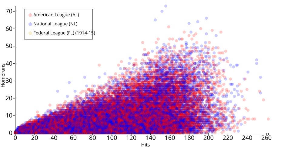 This scatter plot shows hits and homeruns using the baseball dataset. For my iteration, I did two things. Firstly, I included the Federal League in my chart. Even though it only existed from 1914-15, it played a significant role in the evolution of baseball. Secondly, I added a legend to the chart. In my original plot I colored the dots by league but I never added a legend, nor did I describe the meaning of the colors in the README. Thus, that part of the chart was not useful at all.