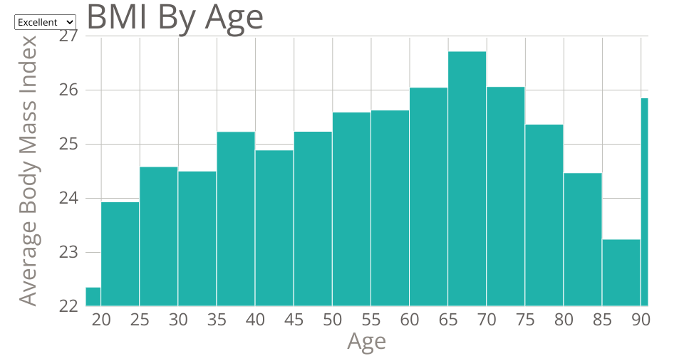 This visualization is a histogram of Body Mass Index by health status from the CDC Dataset.