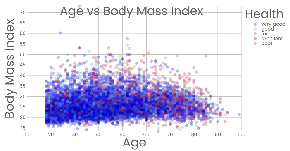 This visualization is a scatterplot of age vs. body mass index distinguished by health status from the CDC Dataset.