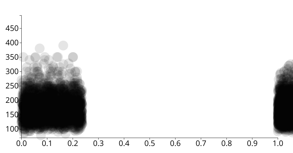 This visualization is a D3 scatterplot of exercise (0 shows no exercise and 1 shows exercise) vs. weight from the CDC Dataset.