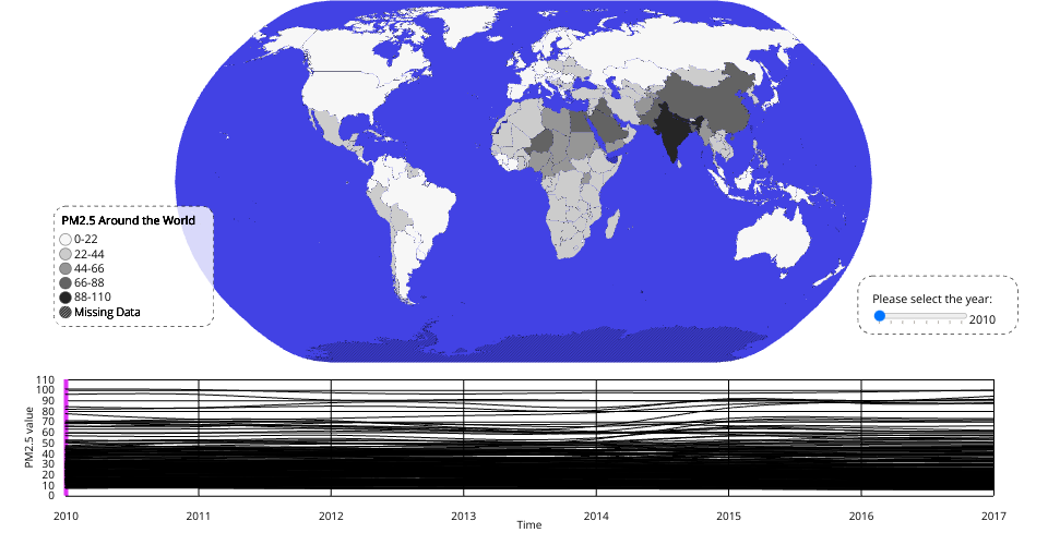 The data is processed and melt to fit the visualization. It realize a Choropleth Map of the world to show the PM2.5 value in a specific year and the distribution around the world.