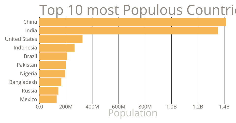 This bar chart shows population of the top 10 most populous countries. The data comes from the year 2018 estimate in United Nations: World Population Prospects 2017. It also demonstrates customization of D3 axes.