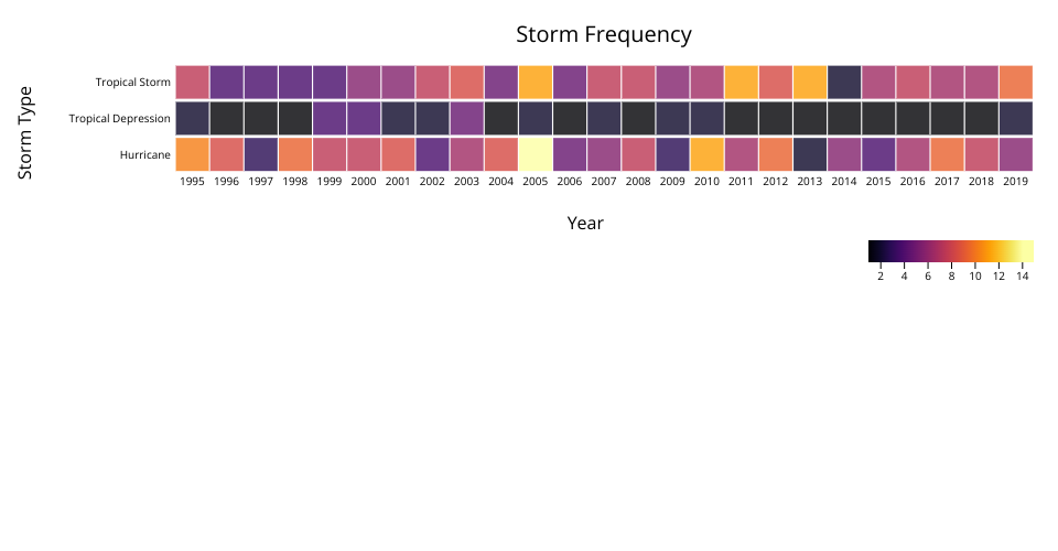 A heatmap depicting the frequency of different tropical storms from 1995-2019