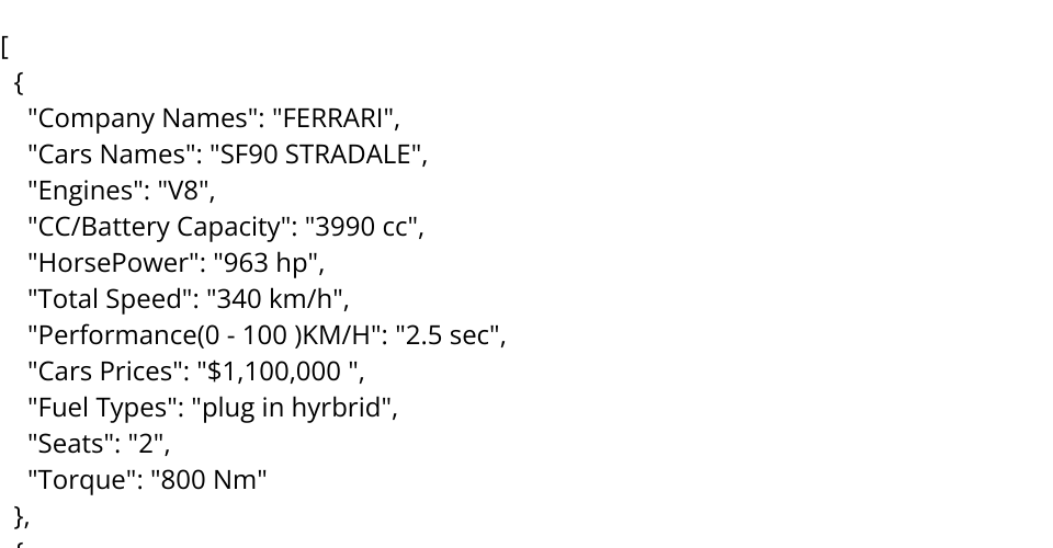 This dataset is a set data that documents information about cars by company name (Company) and Model (Cars Name). The information about the cars includes: engine type (Engine), displacement or battery (CC/Battery Capacity), horsepower (HorsePower), top speed (Total Speed), 0-100 km/h time (Performance(0 - 100)KM/H), car price (Cars Prices), type of fuel used (Fuel Types), number of seats (Seats), and engine/motor torque (Torque).