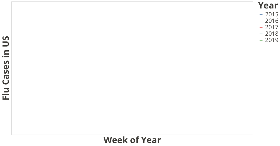 This graph shows the national ILI total cases annually. The curves from 2015 to 2019 to the present date are displayed. This plot achieves the visualization of the annual ILI total patterns in general, and also provide a direct comparison year-over-year. We can tell 2018 is the year with highest Flu cases in mid February time, while 2019 has a more stretched Flu season comparing to other years.