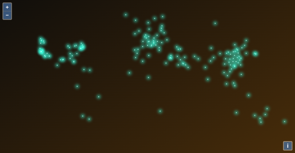 Each point on the map is a location for which there was at least one confirmed Coronavirus case as of 3/5/2020. Each location is shown as the same size and intensity, regardless of how many cases there were (this is a shortcoming of this visualization).