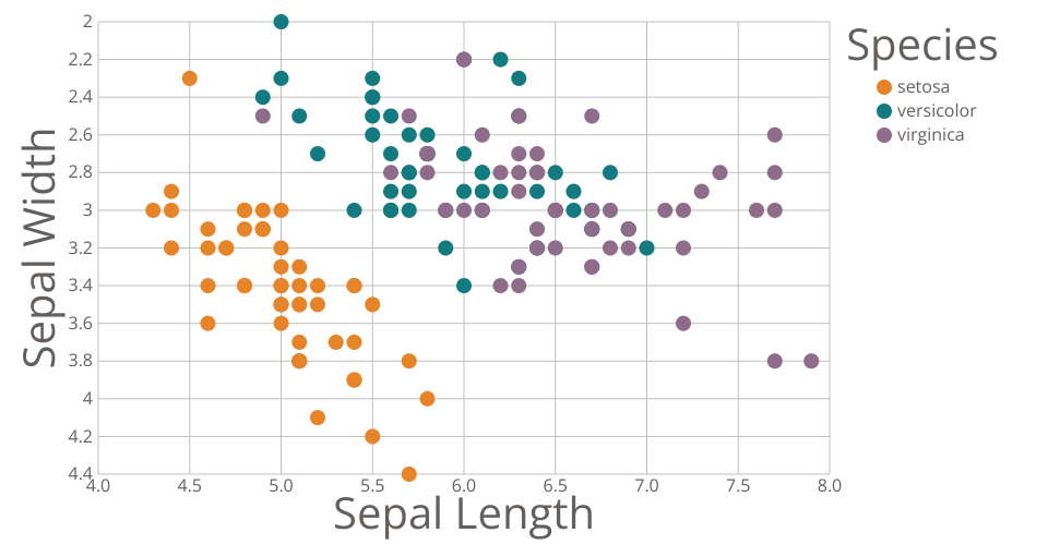 A scatter plot with an interactive color legend using the Iris Dataset 'https://gist.githubusercontent.com/curran/a08a1080b88344b0c8a7/raw/0e7a9b0a5d22642a06d3d5b9bcbad9890c8ee534/iris.csv';