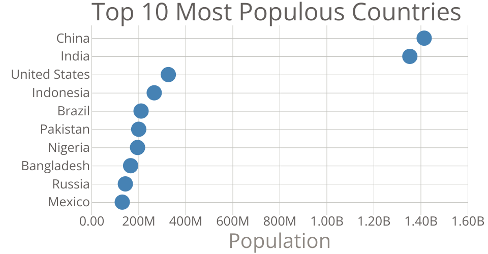 This bar chart shows population of the top 10 most populous countries. The data comes from the year 2018 estimate in United Nations: World Population Prospects 2017.