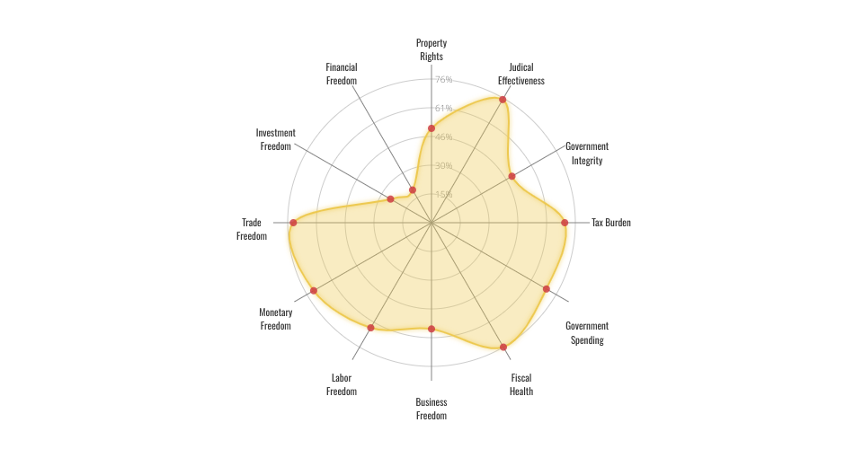This is a gorgeous radar chart designed by Nadieh Bremer. So far I am doing well on integrating it with my World Economic Freedom Index dataset.