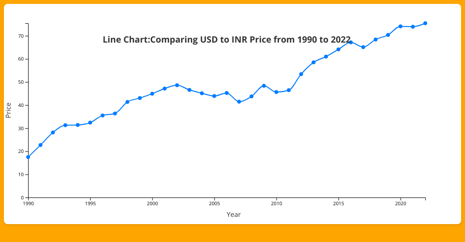 ICE-7:-Line Chart:-Comparing USD to INR Price from 1990 to 2022
