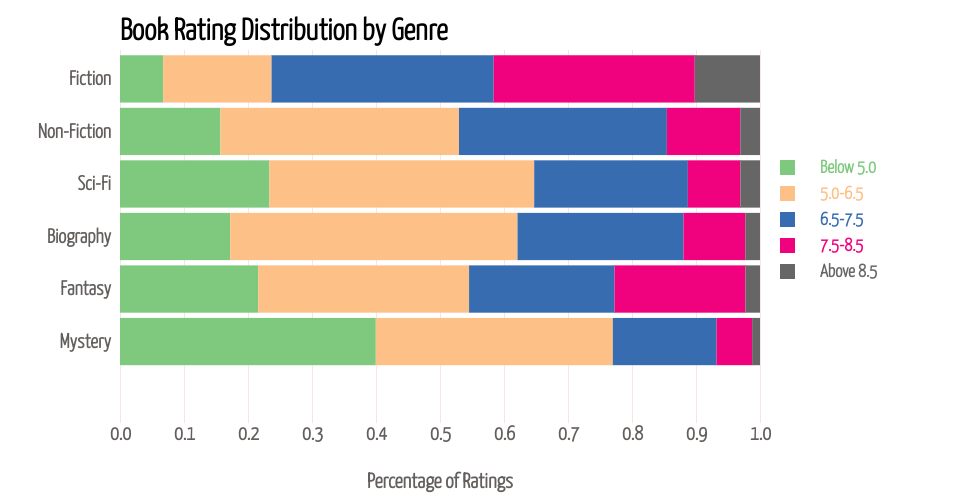 This stacked bar chart gives the percentage of each rating level within different movie genres. The aim is to show the impact of genre on movie ratings. When the mouse hovers over each bar, you can see pop-ups of accurate percentage of each rating level within each genre. Total percentage is 1, representing 100%.