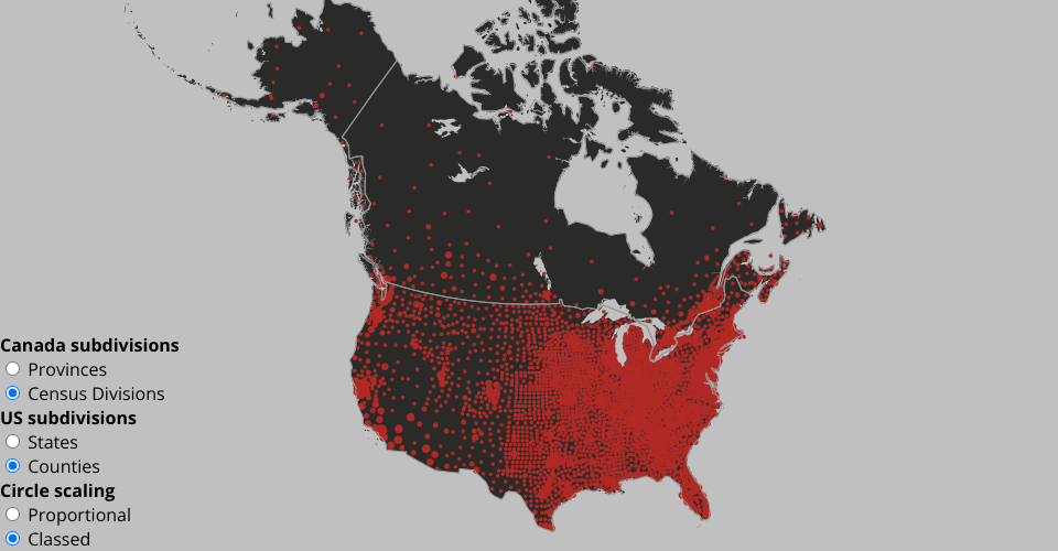 2016 Canada Census Division populations from: https://www12.statcan.gc.ca/census-recensement/2011/geo/bound-limit/bound-limit-2016-eng.cfm 2019 US county populations from: https://www.census.gov/data/datasets/time-series/demo/popest/2010s-counties-total.html