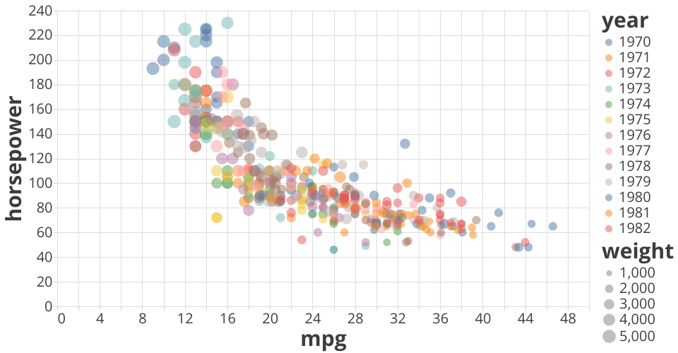 The data shown here comes from the UCI Machine Learning Repository: Auto MPG Data Set, via Gist: Scatter Plot with Menus.