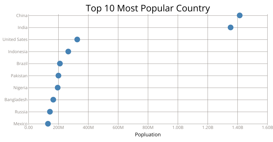 This bar chart shows population of the 10 most populous countries. The data comes from the year 2018 in United Nations World Population Prospects 2017