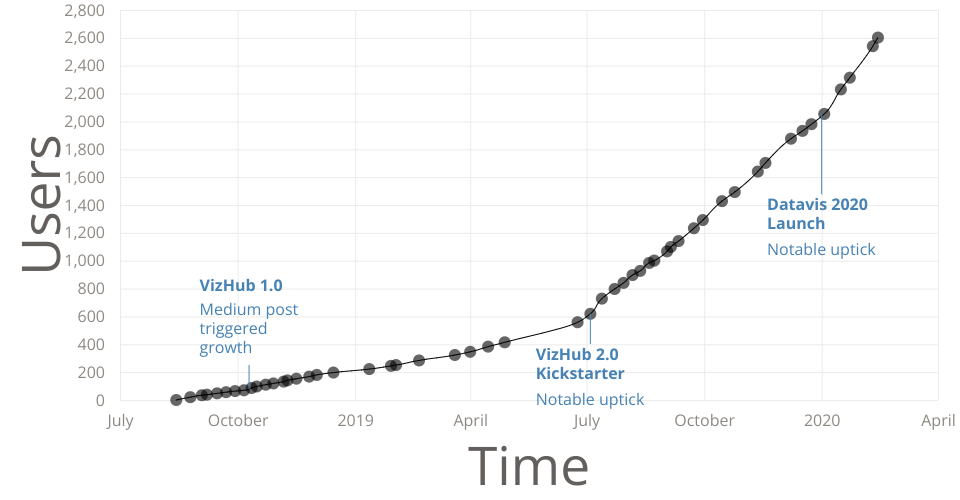 The number of VizHub users over time, since it was launched on August 14, 2018.