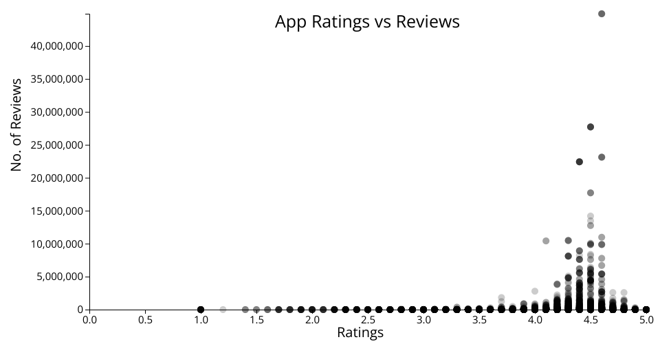 This visualization shows Google Play Store Apps Dataset. It visualizes the average ratings of apps vs the number of reviews given by users. Each circle represents the Google Play Store App.