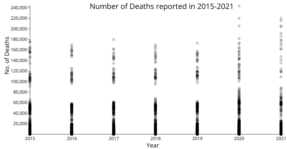This visualization shows World Mortality Dataset. It visualizes the number of deaths reported from year 2015 to 2021 across all countries. Each circle represents a country in a given year.