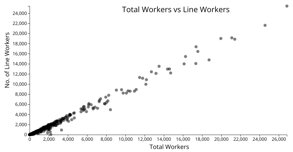 This visualization shows Nike Global Manufacturing Data Export. It visualizes the total number of workers vs the number of line workers across Nike manufacturing factories all over the world. Each circle represents a Nike manufacturing factory.