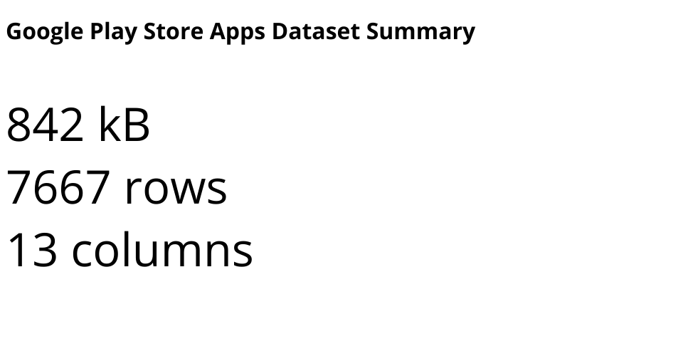 This program loads and parses Google Play Store Apps Dataset. It consists of apps available on Google Play Store along with their ratings, number of downloads, free/paid, version support, category etc. This visualization shows size of the dataset and available number of columns & rows in the dataset.