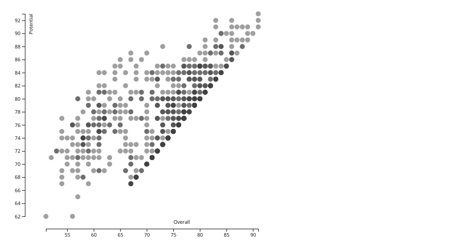 Using brushing, the user can select an area of interest and a table of the relevant players can be seen acompanying the selection. This allows the user to see some additional data along with the inferences being drawn from the graph.