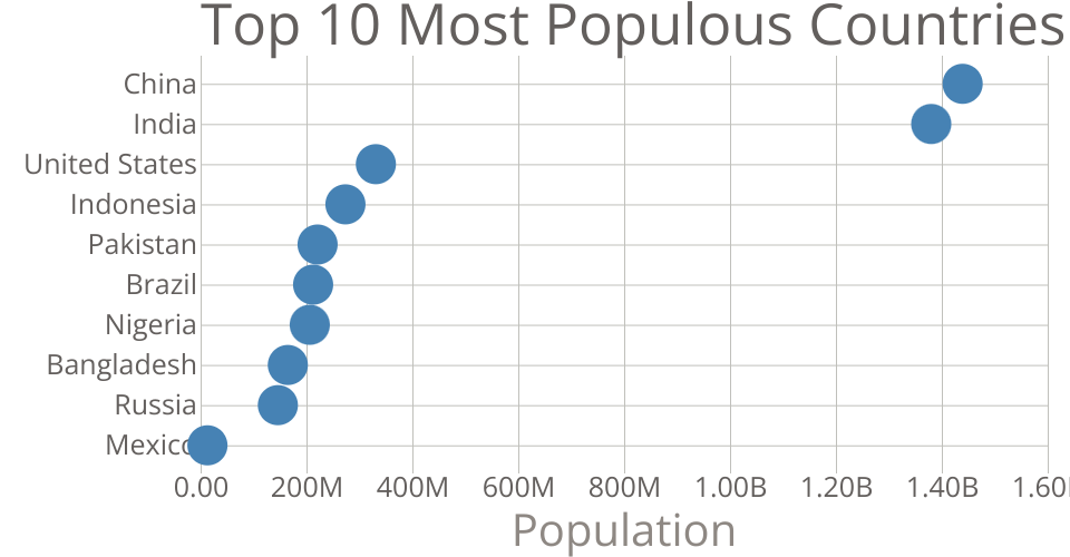 This bar chart shows the population of the top 10 most populous countries. The data comes from Worldometers: Countries in the world by population (2020) and is based on the latest United Nations Population Division estimates.