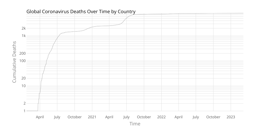 Line chart of Coronavirus cases to date, by country. Data from Johns Hopkins Coronavirus Dataset.