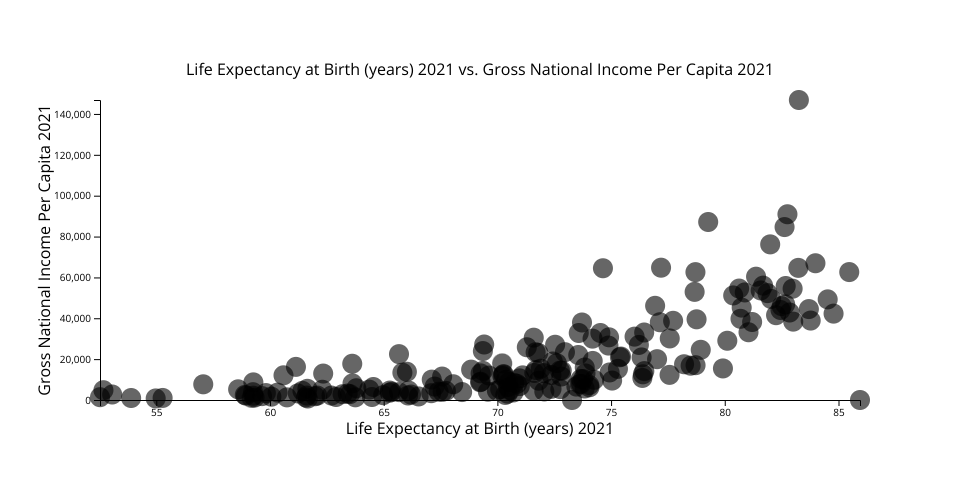 A simple scatterplot of the HDI dataset: https://gist.github.com/smcavey/5f819b6d6a270c6de339532a592399d4 Comparing mean life expectancy at birth in the year 2021 (x) vs. gross national income per capita in the year 2021 (y). Pretty clear trend. Added opacity so its easier to visualize dense clusters. Information on the outliers would be nice, such as using a mouse hover to see the country name