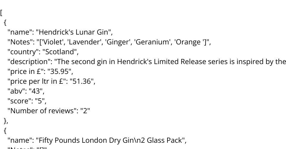 A dataset on gin reviews fetched from: https://www.kaggle.com/datasets/akhilreddy9554/gin-dataset. Includes a score out of 5, gin name, notes, country of origin, price in GBP, abv %, # reviews, and a description.