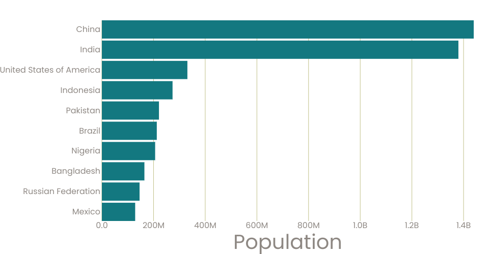 A program that shows the top 10 most populous countries as a pathetic bar chart with no axes.