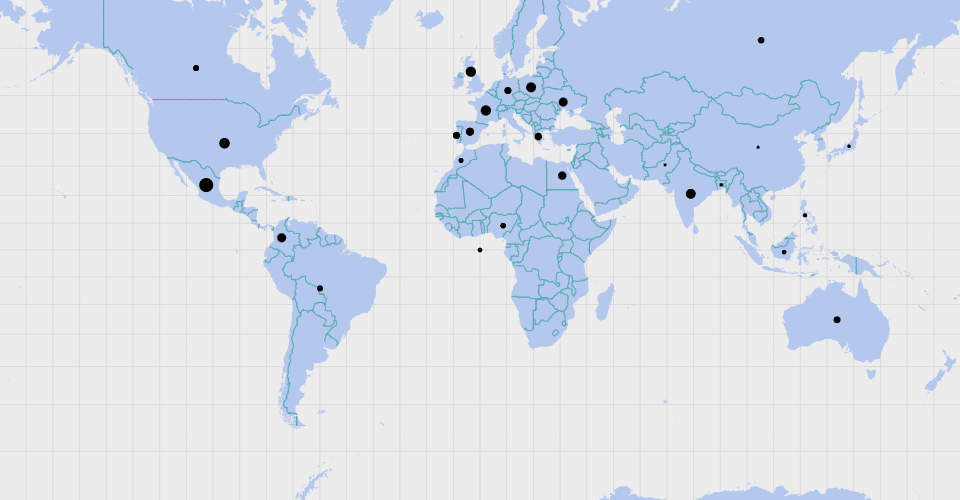 The world map behind the points is a Mercator type map using the World Atlas TopoJSON. The points are off by a small fraction (down and to the left) however it fits much better on the Mercator projection over the Natural Earth projection. When the user hovers over each point, they can see the latitude and logitude of that deployment.